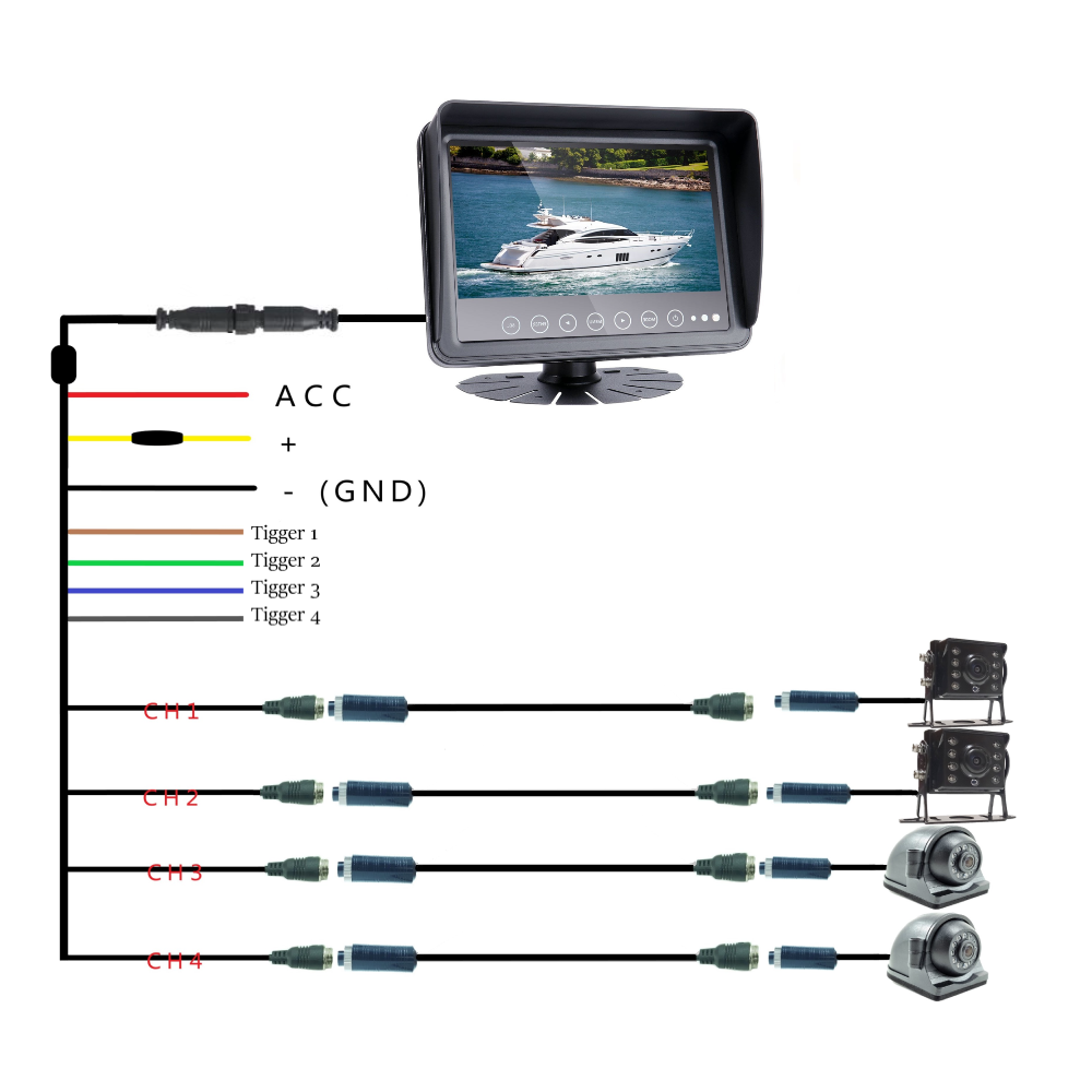 Support 4 cameras input, Support 4/3/2/1 image output meanwhile. 4 trigger wire