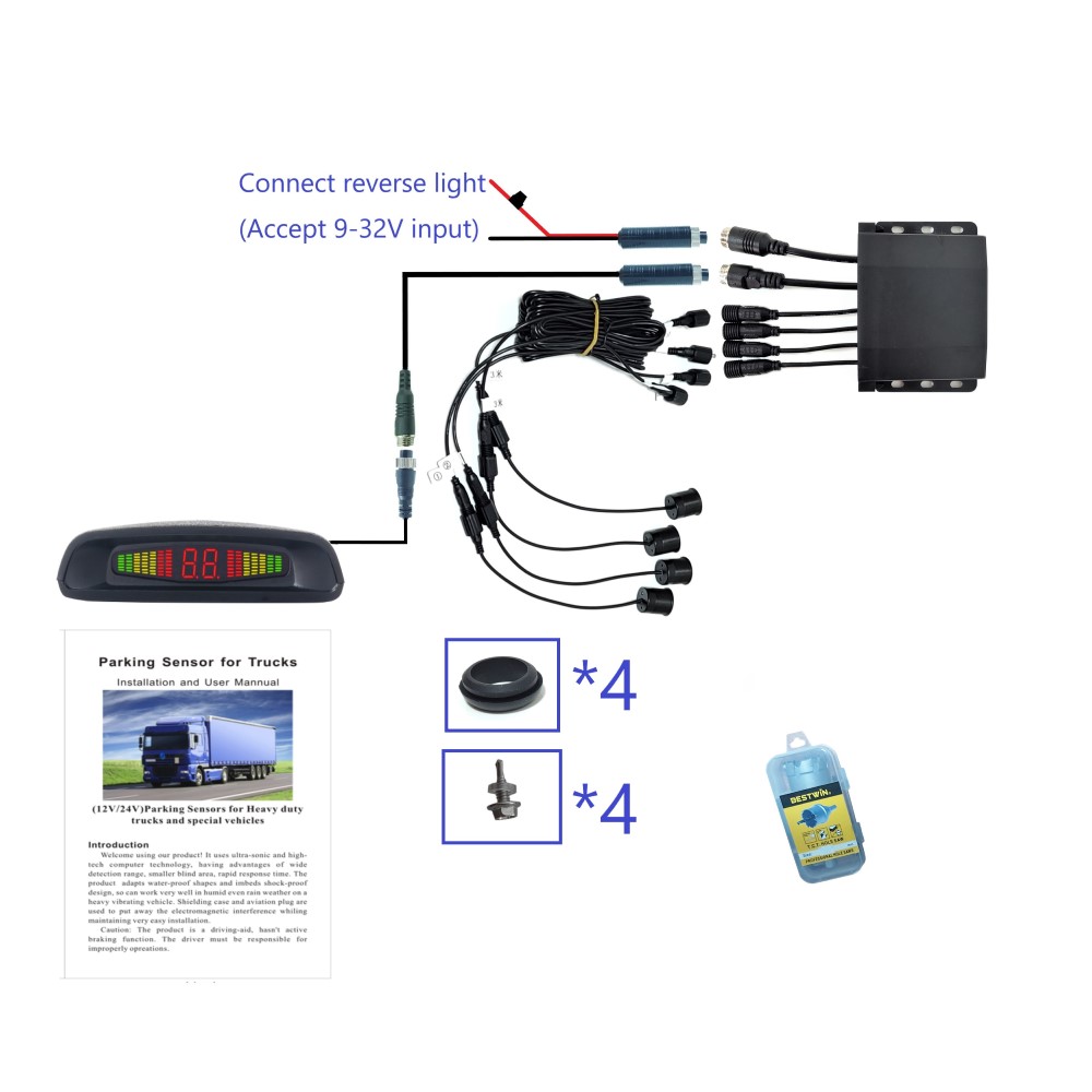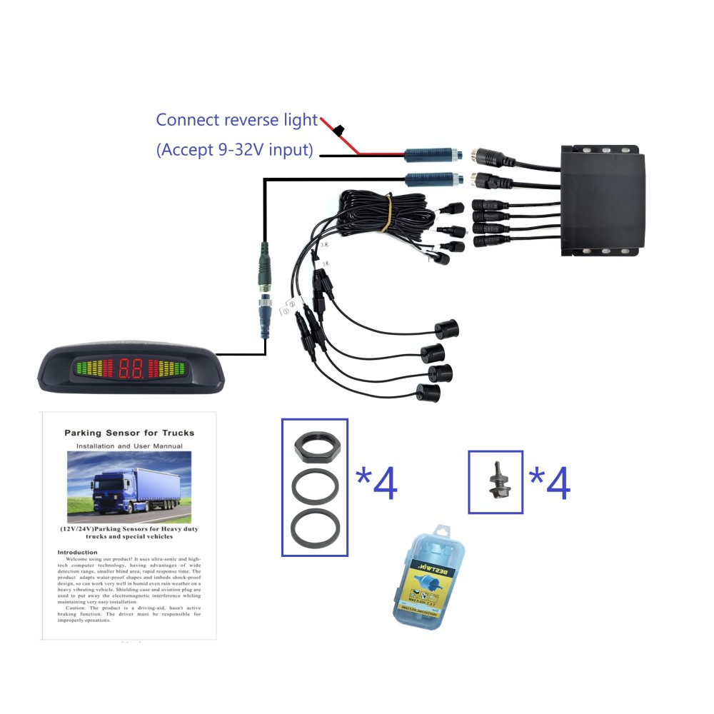 10.Standard Parts:4*21mm dual angle sensors(Metal shell),4*Butterfly sensor Holder,4*3M sensor cables,1*LED buzzer,1*15M buzzer cable,1*host,1*1M power cable