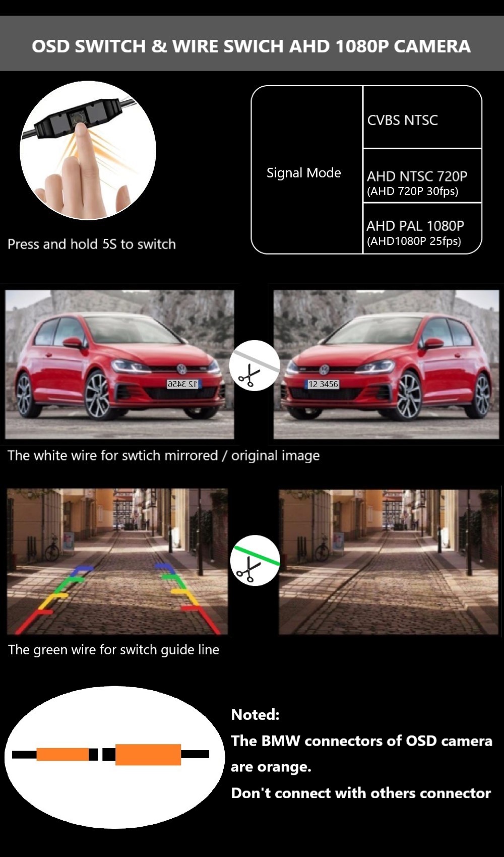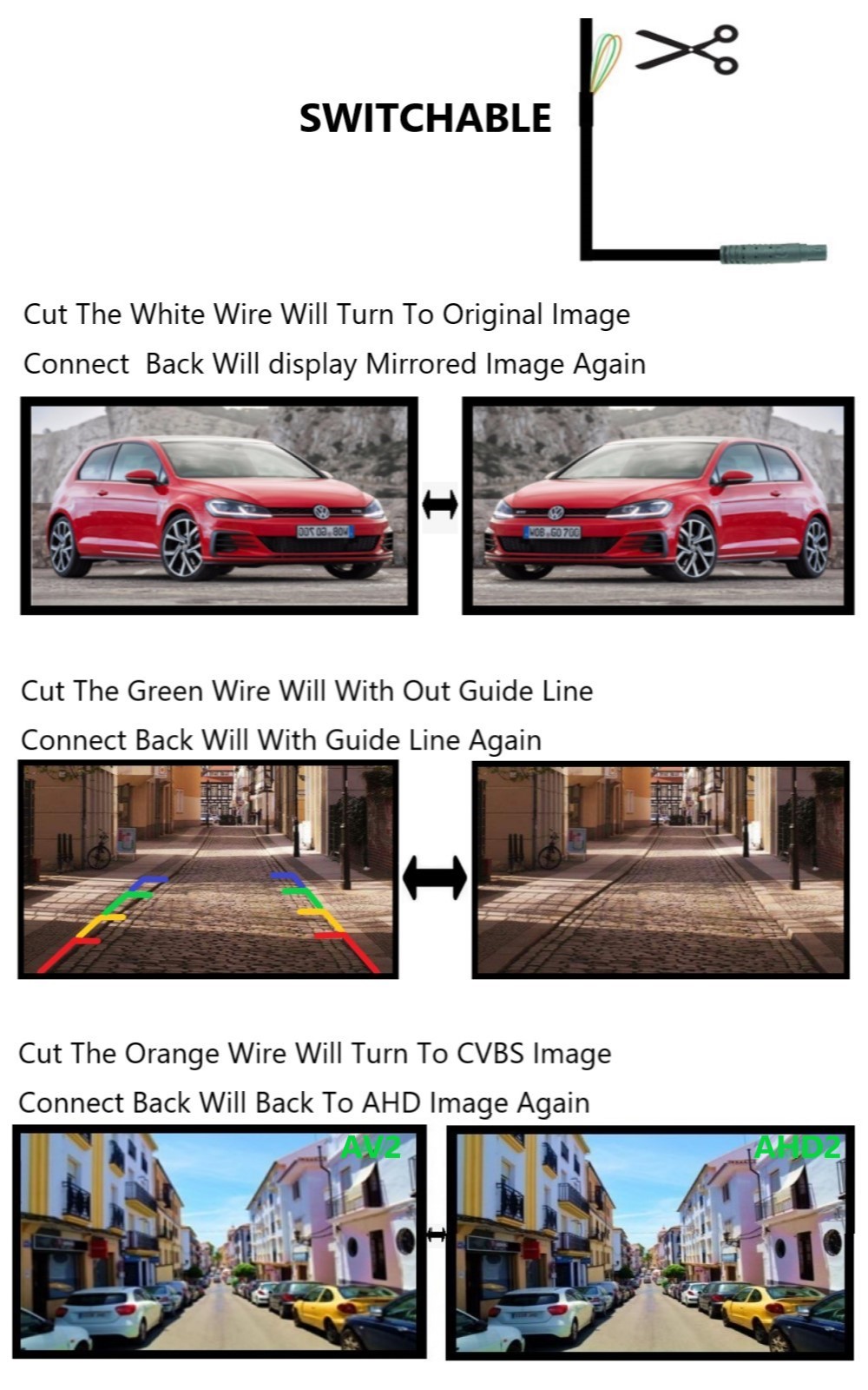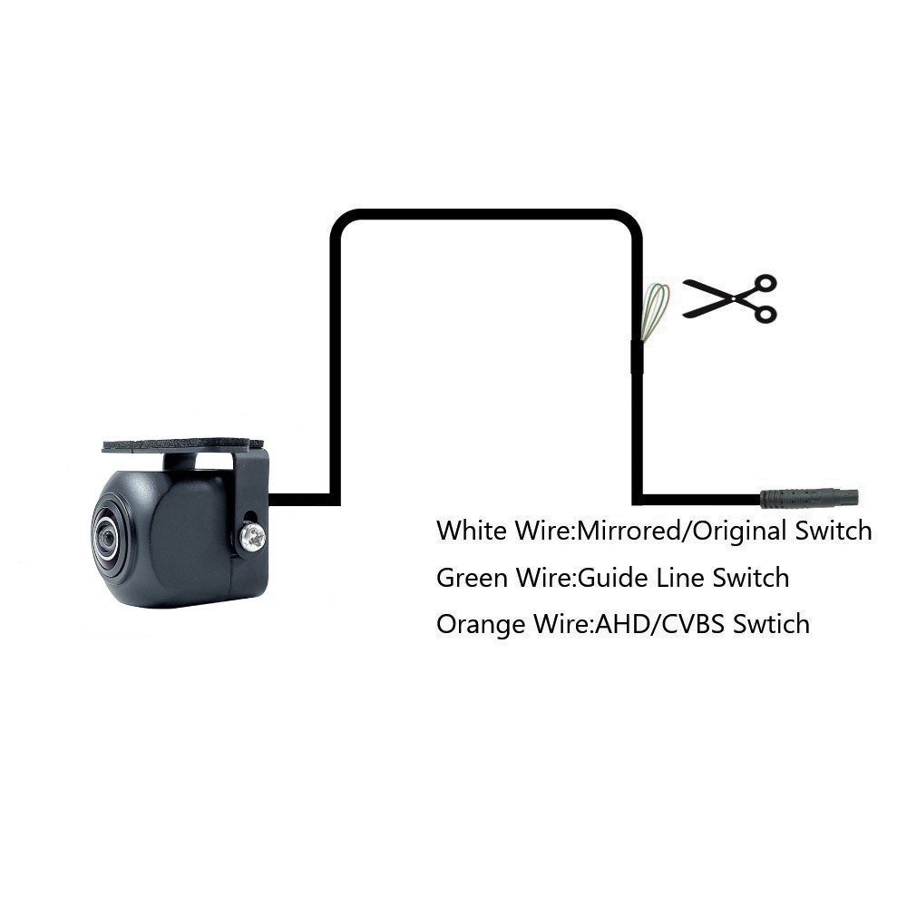 6.white wire: mirrored/original Switch; green wire:guide line switch;Orange Wire:AHD/CVBS switch.Default: AHD/Mirrored/Guide line