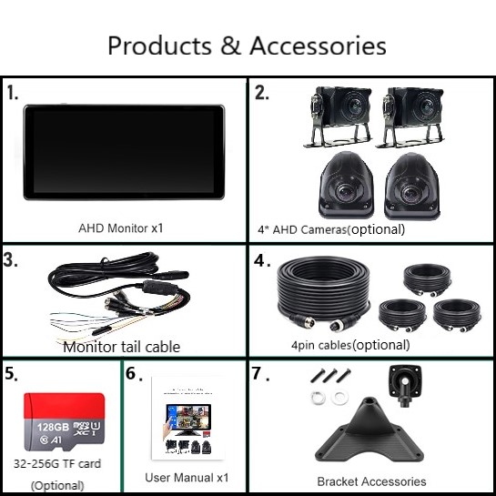 Accessories:monitor+Manual+Tail cable+bracket+screws
